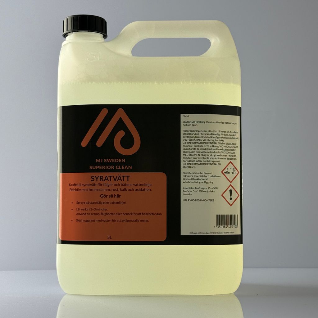 Syratvätt är ett högeffektivt och surt rengöringsmedel framtaget för fabrikslackerade aluminiumfälgar och båtens vattenlinje. Den kraftfulla formulan baserad på fosforsyra biter effektivt på de tuffaste beläggningarna som vanliga rengöringsmedel inte rår på.